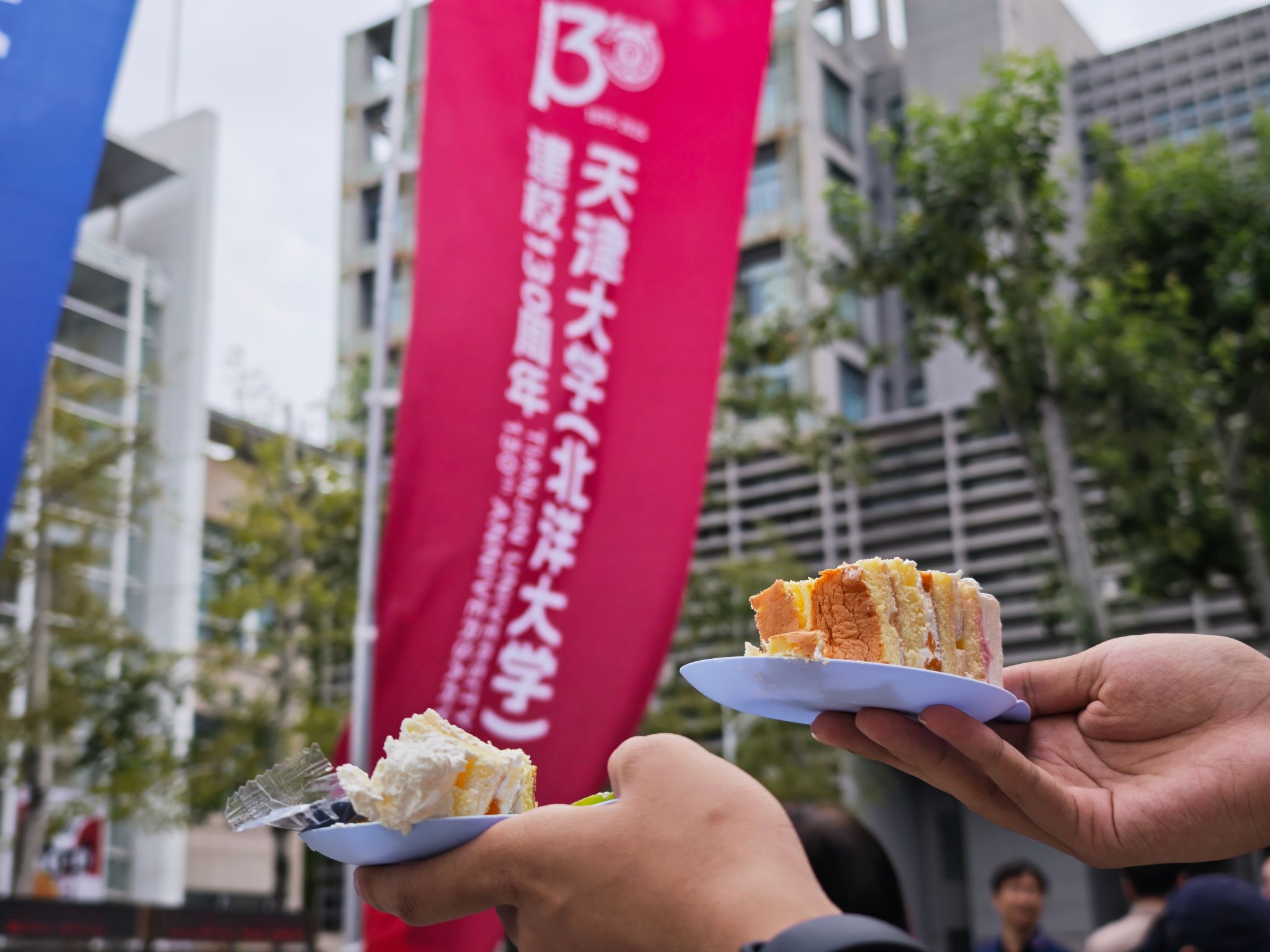 10月2日当天半夜12时,北洋园校区竹园餐厅内,一个巨型校庆华诞蛋糕方才做好。蛋糕长13米,宽80厘米,厚10厘米,用鲜花、各色生果和苦涩的巧克力粉饰,两头则是3D打印的校庆从题。除竹园餐厅的巨型蛋糕外,当天半夜双校区各食堂还预备了11个长1。3米的校庆蛋糕,供师生们一路分享母校华诞的喜悦。