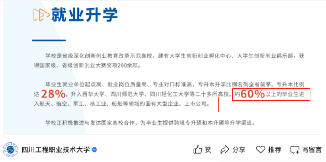 学校最新发布的就业数据显示:60%以上的结业生都能进入航空航天、军工、核工业、船舶等范畴的国有大型企业和上市公司。