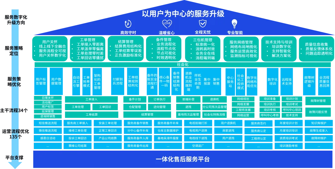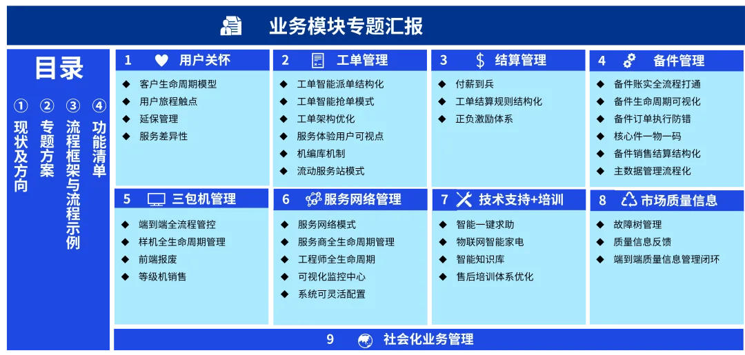 连系企业全体计谋、行业趋向取标杆研究,并融入AI手艺前景评估,明白企业将来办事的智能化定位——例如基于数据的个性化办事、预测性、从动化运营等。针对营业调研中的痛点取差距,设立AI立异专题(如智能客服、工单从动、质量预测等),通过专项研讨构成可落地的智能化场景,并将其融入营业流程设想。正在梳理营业功能取环节行动时,明白哪些环节可通过AI提拔效率或体验(如用机械进修优化备件预测、用计较机视觉辅帮近程维修),并对AI赋能点进行优先级排序取线图规划。正在L1-L4流程设想中,标识可被AI优化的节点(如智能诊断、从动结算、办事商智能评估),并设想响应的人机协同流程取处理方案。规划支持将来3–5年营业成长的使用、功能、数据取集成架构,明白AI中台或智能模块的,确保架构具备数据接入、模子摆设取迭代扩展的能力。梳理系统功能时,逐项评估其取AI手艺的连系点(如天然言语处置用于用户反馈阐发、RPA用于对账从动化),对暂不支撑的功能提出定制化或外接AI办事的方案。AI赋能的泛家居办事数字化转型方案,毕马威基于行业洞察、企业现状取手艺趋向,提出以AI为焦点引擎的泛家居办事营业构思取高阶蓝图。