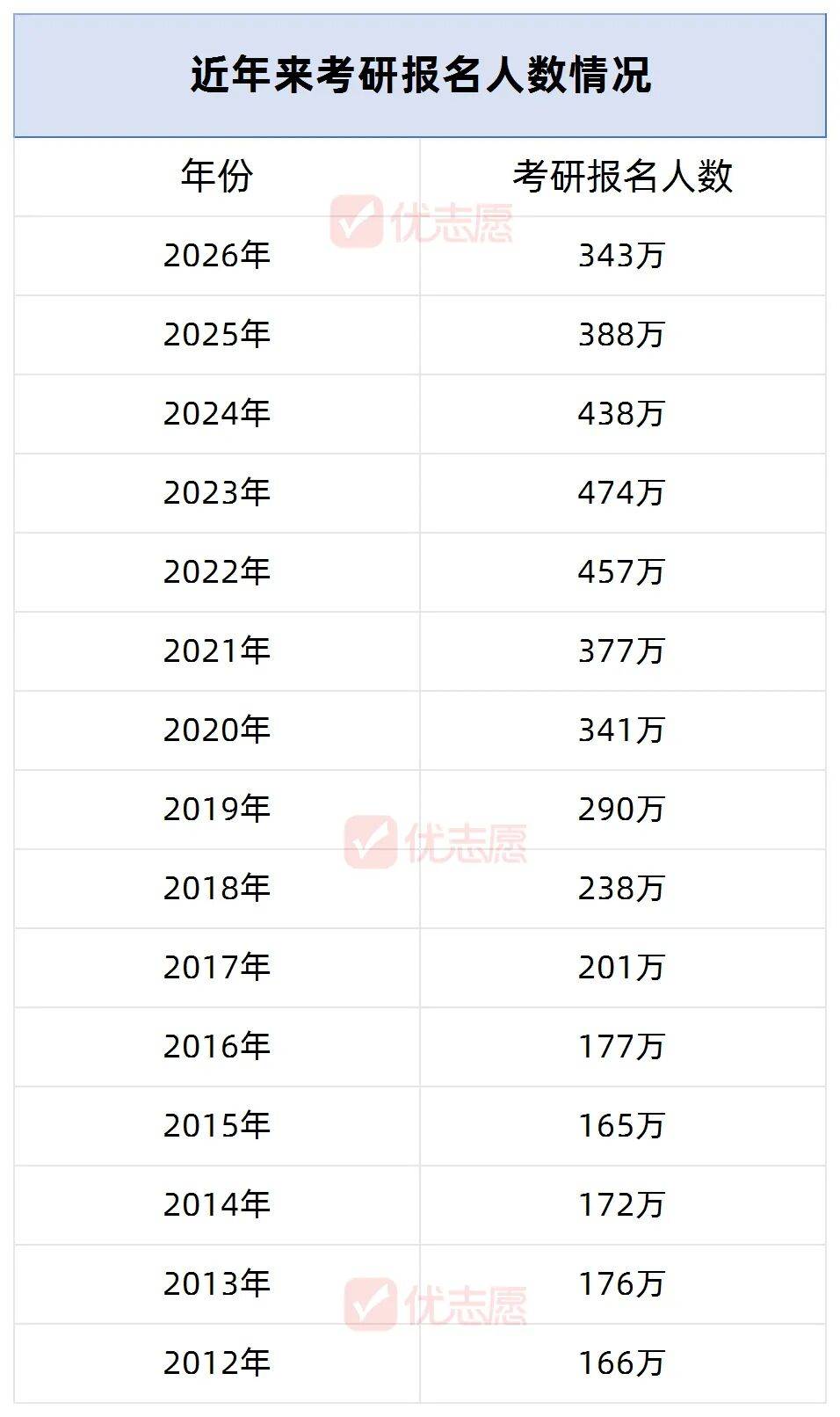 近日,教育部正式发布2026年全国硕士研究生招生测验报名数据,全国报考总人数为343万。这一数字延续了2024年以来的下降趋向,