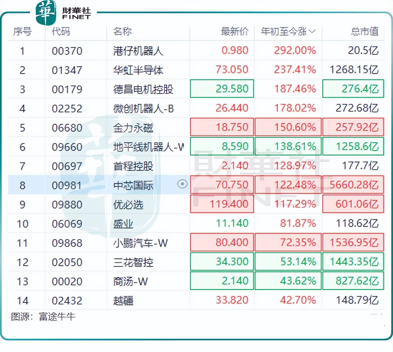 本钱市场也赐与了强烈热闹反馈。富途牛牛数据显示,岁首年月至今,机械人板块中的港仔机械人(00370。HK)和华虹半导体(01347。HK)股价累计翻超2倍;微创机械人(02252。HK)、地平线。HK)、优必选等抢手股也均涨超100%。