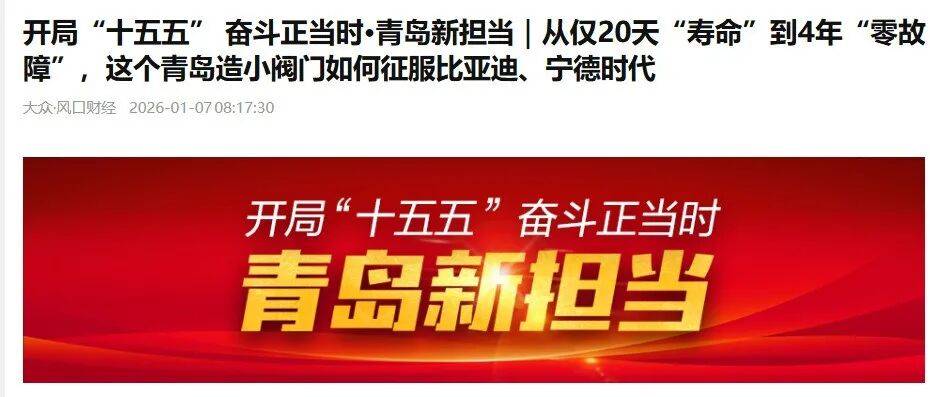 近日,公共旧事·风口财经以《从仅20天“寿命”到4年“零毛病”,这个青岛制小阀门若何降服比亚迪、宁德时代》为题,推出专题文章,聚焦精锐机械,讲述了一个关于“冠军”若何以“处理实痛点”为旨,正在细分范畴里开掘出广漠蓝海的故事。细致请看报道原文: